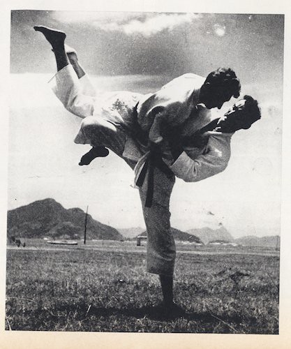 The photo in question is a training shot of Carlos Gracie Sr. (executing the technique) on his younger brother Hélio Gracie. Photographer José Medeiros took this series of shots during Gracie family training. this picture was first published in the Brazilian magazine O Cruzeiro on January 14, 1950, in an article “Hélio Gracie desafia Ezzard Charles” by Luciano Carneiro (with photos by Medeiros).